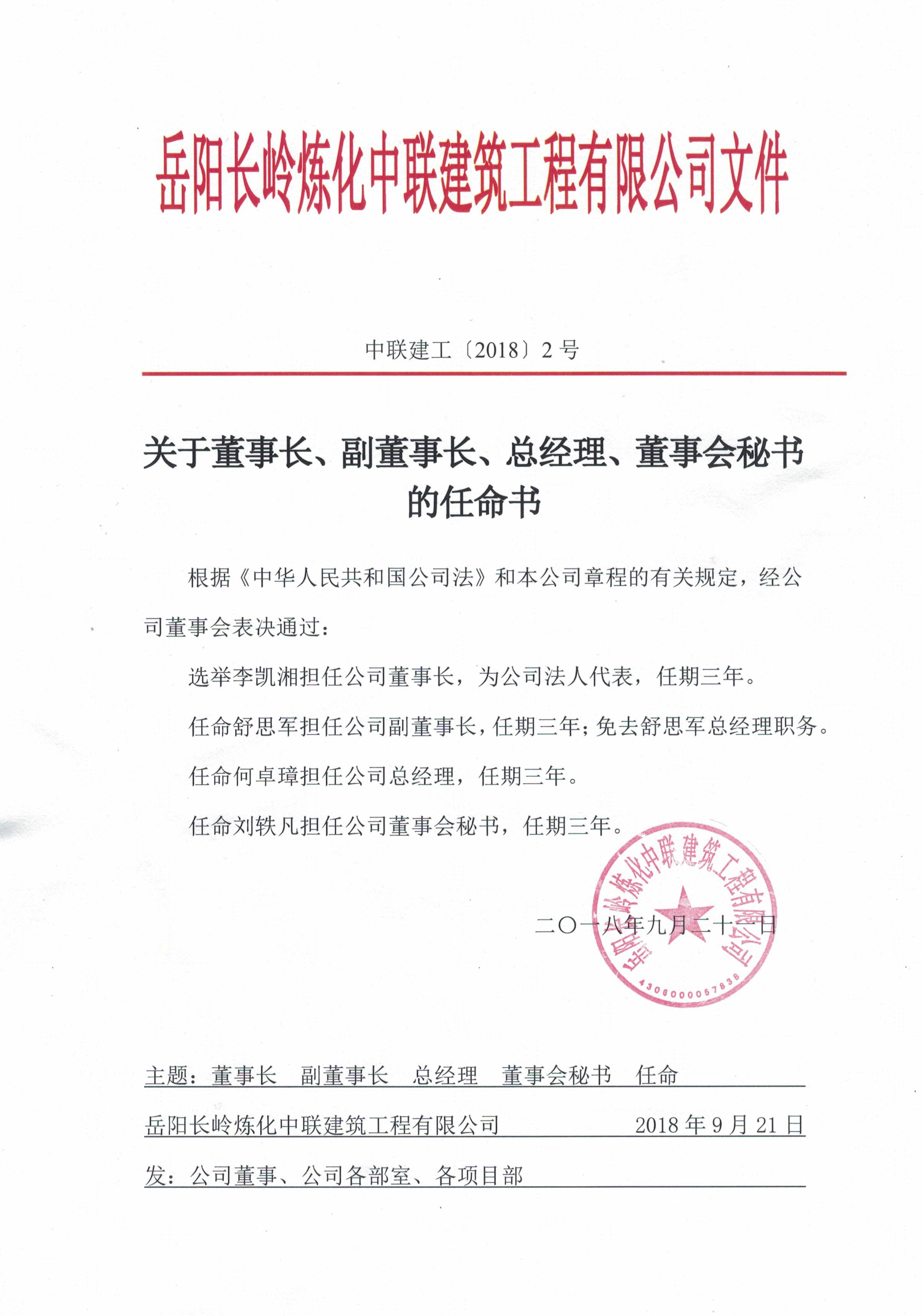 選舉李凱湘擔(dān)任公司董事長(zhǎng),為公司法人代表,任期三年。